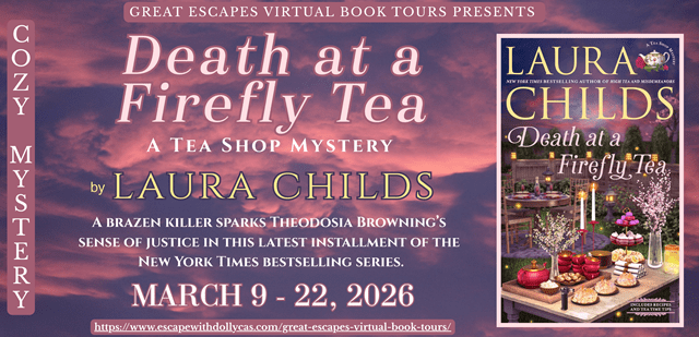 Welcome to my stop on the Great Escapes Virtual Book Tour for Death at a Firefly Tea (A Tea Shop Mystery) by Laura Childs. Stop by each blog on the tour for interviews, guest posts, spotlights, reviews and more!