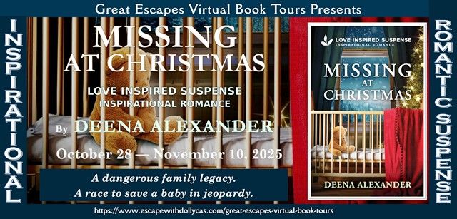 Welcome to my stop on the Great Escapes Virtual Book Tour for Missing at Christmas (Love Inspired Suspense) by Deena Alexander. Stop by each blog on the tour for interviews, guest posts, spotlights, reviews and more!